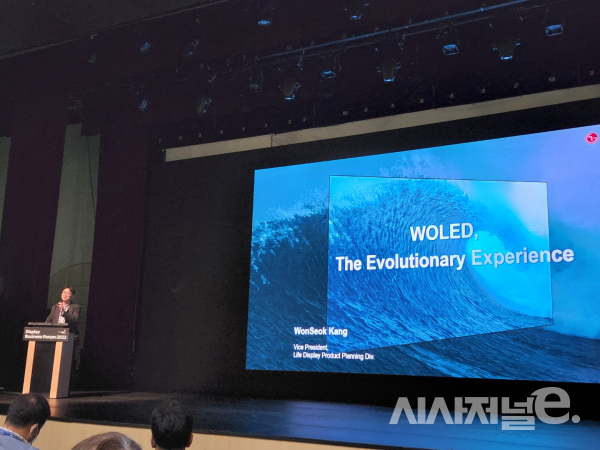 강원석 LG디스플레이 라이프디스플레이상품기획 태스크리더(상무)는 11일 서울 강남구 코엑스에서 열린 ‘디스플레이 비즈니스 포럼 2022’ 기조연설에서 ‘OLED, 경험 진화와 새로운 애플리케이션’이란 주제로 대형 OLED 시장의 성장 기회와 LG디스플레이의 사업 확장 전략을 소개했다.