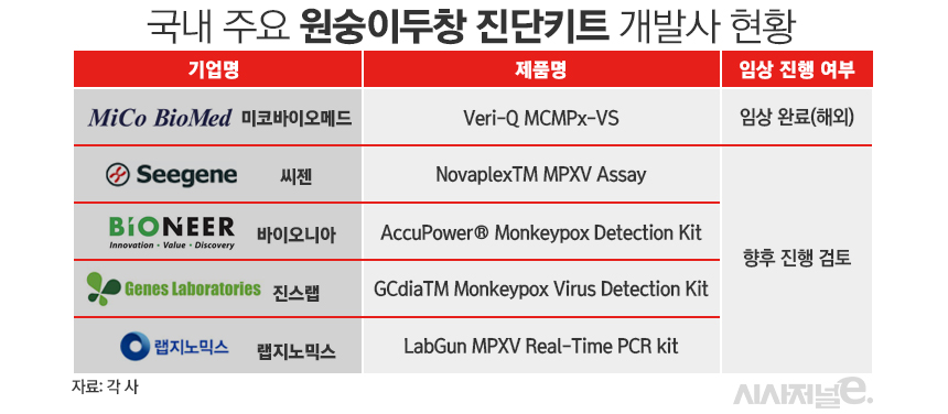 씨젠은 현재 원숭이두창 진단키트를 연구용으로 상용화해, 해외 의료기관에 공급하고 있다. 씨젠 관계자는 "앞으로 확산 추이에 따라 임상 등 대응할 예정"이라고 밝혔다.