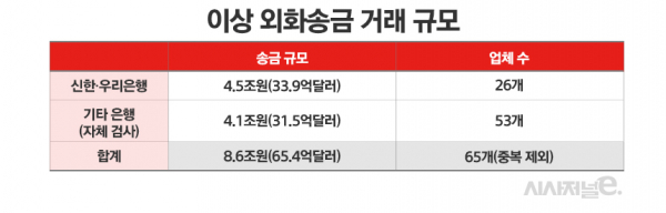 17일 금융당국에 따르면 지난해 1월부터 올해 6월까지 국내 은행에서 발생한 이상 외환송금 의심거래 규모는 총 65억4000만달러(약 8조6000억원)인 것으로 파악됐다. 금융감독원은 지난 6월 신한·우리은행으로부터 거액의 이상 외화송금 거래 사실을 보고 받고 현장검사를 실시했다. 그 결과 약 33억7000만달러(약 4조5000억원)의 이상 거래가 발견됐다. 이에 금감원은 모든 은행에 자체 조사를 지시했고, 추가로 31억5000만달러(4조1000억원)를 확인했다.