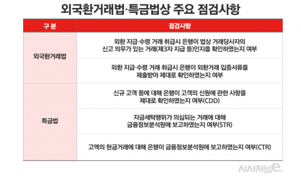 은행권이 걱정하는 대목은 금감원이 또 다시 내부통제를 문제 삼을지 모른다는 점이다. 앞서 당국은 사모펀드 사태의 책임이 부실한 내부통제 때문이라는 이유로 은행장 등 금융사 CEO들에게 징계를 내린 바 있다. 금감원은 일단 문제가 된 외환거래가 발생한 지점에서 외국환거래법과 특정금융정보법을 어긴 사실이 있는지 살펴본다는 입장이다. 외국환거래법에 따라 은행은 외환거래 입증 서류를 제출 받아 확인해야 하며, 거래 당사자 외에 제3자에게 송금이 이뤄지는 경우도 체크해야 한다. 또 특금법은 자금세탁행위가 의심되는 합당한 근거가 있는 경우 이를 금융정보분석원에 보고하도록 돼 있다.