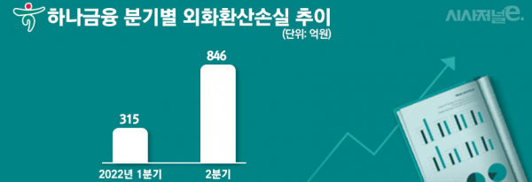 환율 급등으로 하나금융은 상반기에 이어 하반기에도 비화폐성 외화환산손실이 늘어날 것으로 전망된다. 상반기 외화환산손실은 1161억원을 기록했다. 환율이 출렁일 때 마다 하나금융의 손실 규모가 불어나는 것은 어제 오늘 일이 아니다. 하나금융은 외환은행을 품에 안으면서 해외 자회사들을 대거 얻었지만 동시에 외화 부채도 크게 늘었다. 그 결과 환율 변동에 따라 큰 규모의 비화폐성 외화환산손익이 발생했다. 환율이 오르면 손실이 나고 환율이 하락하면 이익이 나는 구조다.