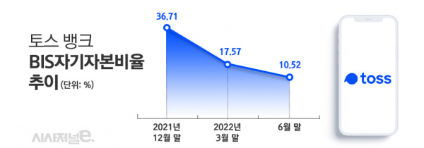 2일 금융권에 따르면 토스뱅크의 올해 6월 말 BIS자기자본비율은 10.52%로 지난해 말(36.71%)과 비교해 26.19%포인트 크게 하락했다. 규제 하한선(8.0%)에 거의 근접한 수준이다. 토스뱅크는 설립 초이기에 내년까지는 완화된 자본건전성 규제를 적용받는다. 타 은행이 따르는 기준으로는 이미 규제치(10.5%)를 하회한 셈이다.