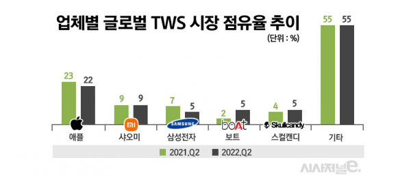 중저가 제품 판매량이 늘어나면서 100달러 미만 TWS를 선보인 업체들의 시장 점유율은 전년 수준을 유지하거나 소폭 상승했다. 2위인 샤오미는 보급형 제품 출시에 주력하면서 9%의 시장 점유율을 유지했다. 삼성전자와 함께 공동 3위에 오른 보트와 스컬캔디 점유율도 5%로 지난해 2분기보다 각각 3%포인트, 1%포인트 올랐다.