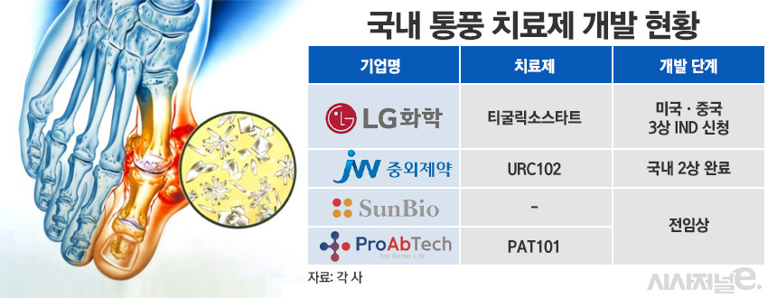 이밖에도 선바이오, 프로앱텍 등 국내 바이오벤처들도 통풍 치료제 개발에 뛰어들어 전임상을 진행 중이다. 프로앱텍은 연내 전임상을 마치고 1상에 진입한다는 목표다.