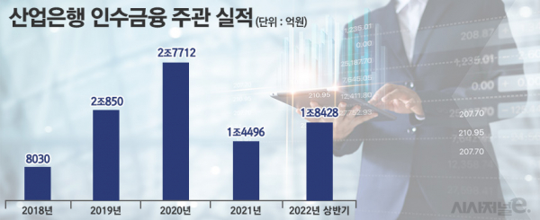 산업은행의 인수금융 실적은 2019~2020년 동안 급증했다. 국회예산처에 따르면 산업은행의 2019년 인수금융 시장점유율은 12위에서 3위로 크게 뛰어올랐다. 인수금융 주선액(2조9850억원)과 대출액(1조5270억원) 모두 세 배 넘게 증가했다. 이듬해엔 코로나 사태로 주선 실적은 줄었지만, 점유율(11.1%)은 2위로 한 계단 더 뛰어올랐다. 하지만 작년은 실적이 크게 감소했고, 올해 다시 증가세로 돌아섰다.
