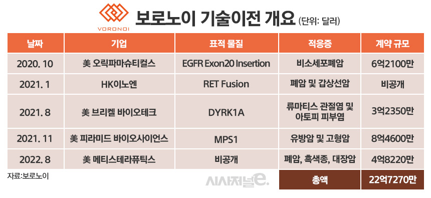 이러한 기술력으로 보로노이는 지난 2020년부터 지난해까지 비소세포폐암 치료제, 자가면역질환 치료제, 유방암 및 고형암 치료제 등 4건의 기술이전에 성공했다. 지난 6월 유니콘 특례제도를 통한 코스피 상장 후 또 한 번의 기술수출로 총 5건의 기술이전 성과를 냈다. 총 계약금은 22억7270만달러(한화 3조1600억원)에 달한다.