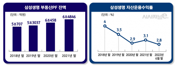 삼성생명의 실적이 줄어들고 있는 원인 중 하나는 운용자산이익률 하락이 꼽힌다. 2018년 4.0% 수준이었던 이익률은 2019년 3.5%로 하락한 뒤 2020년 2.9%까지 내려갔다. 2021년엔 3.1%로 소폭 끌어올렸지만 올 상반기 2.8%로 다시 내려갔다. 삼성생명은 수익률 개선을 위해 부동산PF 대출을 계속 늘리려는 것으로 풀이된다. 김선 삼성생명 최고재무책임자(CFO)도 올해 2월 열린 실적발표회에서 “올해 대체투자 자산 등 자산다변화를 속도감 있게 추진하려고 한다”라고 밝힌 바 있다.
