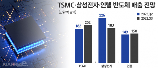 이에 따라 TSMC는 3분기에 글로벌 반도체 매출 1위 기업에 등극할 전망이다. 시장조사업체 IC인사이츠는 TSMC의 3분기 매출 전망치가 202억달러(약 28조1000억원)로 삼성전자(183억달러)와 인텔(150억달러)보다 높을 것으로 내다봤다. 파운드리 업체인 TSMC가 종합반도체기업(IDM)인 삼성전자와 인텔을 제치고 매출 1위를 차지하는 건 이번이 처음이다.
