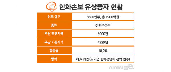 한화손보 관계자는 “유상증자 할 당시 주식시장에선 한화손보의 주가가 오를 수 있다는 전망이 있어 이를 고려해 기준가보다 높은 액면가 5000원에 발행했다"라면서 "자본건전성 관리에 최선을 다할 것"이라고 말했다.