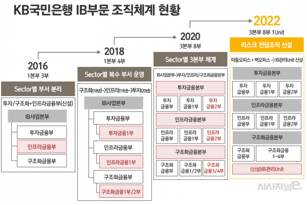 국민은행은 최근 몇 년 간 IB조직을 계속 확장했다. 2016년엔 IB사업본부에 인프라금융부를 신설해 1본부 3부(투자금융부, 인프라금융부, 구조화금융부) 체제로 운영됐다. 이후 2018년엔 각 부서가 복수 부서로 확대됐고, 2020년엔 투자금융·인프라금융·구조화금융부가 각각 본부로 격상되고 각 본부 아래 세 개의 부서가 운영되도록 크게 확장됐다. 그러다 올해 IB관리유닛 조직을 추가해 ‘3본부 8부 1유닛’ 체제가 구축됐다.