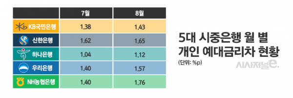 실제로 지난 7월 금융당국의 계획대로 은행권의 신규취급액 기준 예대금리차가 공시된 후 예대금리차는 오히려 더 확대됐다. 지난달 5대 시중은행(KB국민·신한·하나·우리·NH농협)의 가계 예대금리차는 직전 월 대비 1%포인트 내외로 늘었다. 특히 농협은행은 0.36%포인트 급증했다.