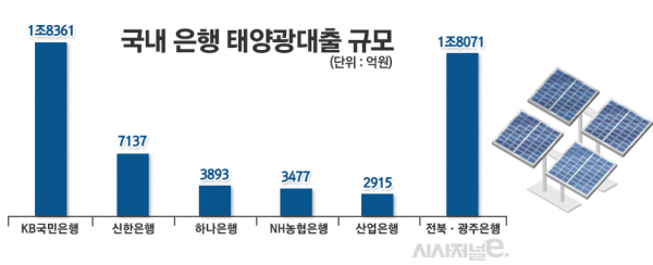 [시사저널e=유길연 기자] JB금융지주가 국내 은행권에서 태양광 대출을 가장 적극적으로 내준 것으로 나타나면서 부실에 대한 우려가 나온다. JB금융이 제공한 대출 가운데 약 3분의 1이 담보 가치보다 더 많이 내준 경우이기에 무리한 대출을 진행한 것 아니냐는 지적이다. 더구나 JB금융의 주된 영업지역인 호남과 수도권 외에서도 대출이 적지 않게 진행된 점도 문제로 꼽힌다.