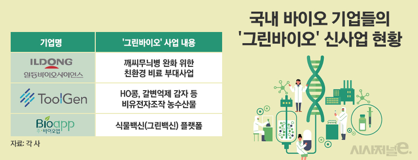 26일 업계에 따르면 국내 바이오 기업들이 친환경 생명공학(그린바이오) 신산업 육성에 나섰다. 바이오산업은 의료·제약 분야의 '레드바이오', 환경·에너지 분야의 '화이트바이오', 농업(농생명소재)과 먹거리 분야를 의미하는 '그린바이오'로 분류된다. 그 중에서도 그린바이오는 가공되지 않은 농수산식품에 바이오 기술을 적용해 다양한 부가가치를 창출할 수 있다는 데서 주목받고 있다. 그린바이오는 한국생명공학연구원 국가생명공학정책연구센터가 선정한 올해 '10대 미래 유망기술'에도 올랐다.