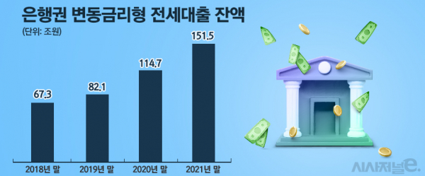 가파른 기준금리 상승으로 인해 가장 어려움을 겪을 차주는 시중금리 상승에 따라 대출금리도 오르는 변동형 전세대출을 받은 2030세대들로 꼽힌다. 진선미 더불어민주당 의원이 금융감독원으로부터 제출받은 전세자금 대출 현황에 따르면 지난해 말 기준 전체 전세대출 잔액 162조원 가운데 변동금리형 대출이 차지하는 비중은 93.5%(151조5000억원)를 기록했다. 변동금리형 대출 비중은 2019년 말 83.2%에서 2020년 말 86.7%로 최근 3년간 계속 늘었다.