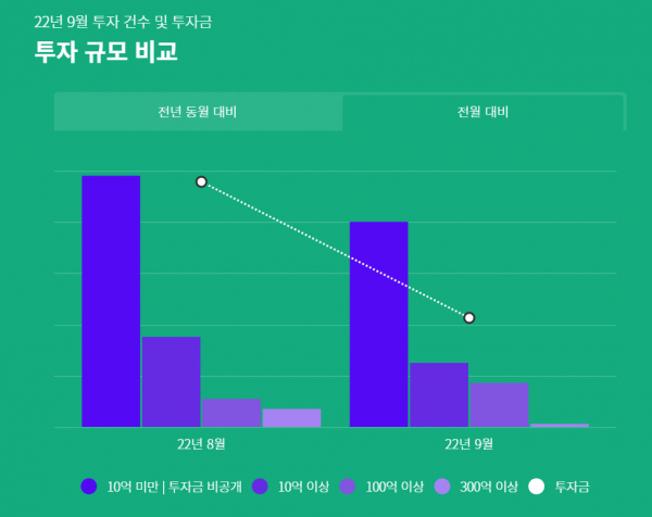 금액별로 보면 300억원 이상 대형 투자 건수가 급감했다. 300억원 이상 투자는 단 한 건에 불과했고, 100억원 이상 투자 17건, 10억원 이상은 25건, 10억원 미만 및 비공개 투자는 80건에 달했다. 500억원대 이상 중대형 투자가 자취를 감춘 데다, 지난달 비교적 적은 금액의 비공개 투자가 많아지면서 전체 투자액 급감으로 이어졌다는 분석이다. 지난해 9월에는 1000억원 규모의 투자를 유치한 두나무를 비롯해 100억원 이상 투자가 29건이에 달했다.