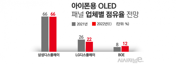 올해 아이폰용 OLED 공급망에서 삼성디스플레이와 BOE의 점유율 전망치는 전년 수준을 유지하거나 증가했다. 옴디아는 삼성디스플레이 점유율을 지난해와 동일한 66%, BOE는 전년(8%) 대비 4%포인트 증가한 12%로 전망했다. 올해 아이폰용 OLED 패널 물량이 전년보다 3000만개 가까이 증가할 것이란 점을 감안하면, 삼성디스플레이와 BOE 공급량은 각각 2000만개와 1000만개 이상 늘어난단 관측이다.