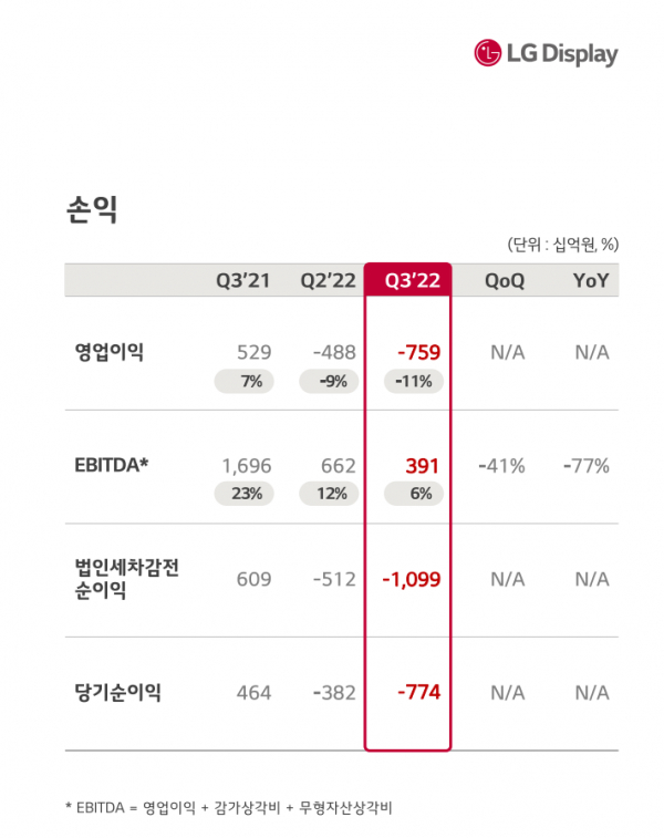 [시사저널e=이호길 기자] LG디스플레이가 지난 3분기 연결 기준 매출 6조7714억원, 영업손실 7593억원을 기록했다고 26일 밝혔다. 매출은 전년 동기 대비 6.3% 감소했고, 영업손실을 기록하면서 적자 전환했다. 전 분기와 비교하면 매출은 20.8% 증가했지만, 적자 규모는 2분기(4883억원)보다 더 확대됐다.