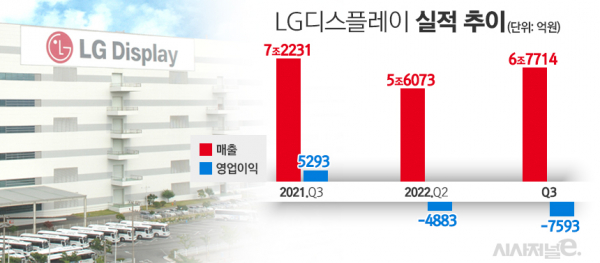LG디스플레이는 27일 지난 3분기 실적을 발표하고 컨퍼런스 콜을 개최했다. 3분기에 7593억원의 영업손실을 기록해 전년 동기 대비 적자 전환했고, 지난 2분기(4883억원)보다 적자 규모도 더 확대됐다.