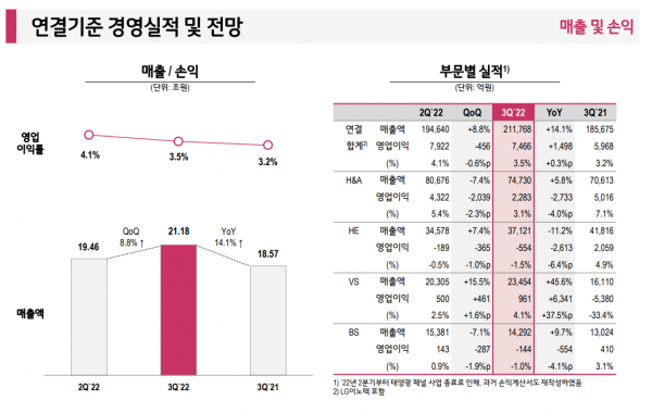 LG전자는 글로벌 인플레이션(물가 상승)과 금리 인상 등 악재에도 신가전 판매 확대와 자동차 부품 성장으로 3분기 최대 매출을 달성했지만, 전년 동기 비경상요인을 감안하면 수요 위축 영향을 받아 수익성이 악화됐다.
