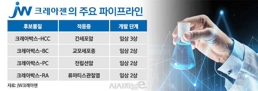 JW크레아젠은 현재 간세포암, 교모세포종, 전립선암, 류마티스관절염 등 4개의 적응증의 파이프라인을 개발 중이다. 그 중 임상 3상으로 가장 앞서있는 '크레아박스-HCC'는 재발 억제를 위한 간암 항암 백신으로 개발되고 있다. 1차 치료로 암 조직 절제술 또는 비수술적 치료를 받은 환자의 70%가 5년 내 재발되는데, 이를 막기 위해서다.