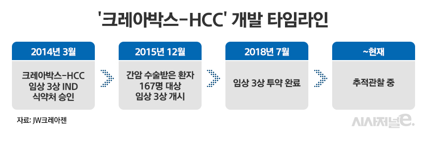JW크레아젠 관계자는 "3상 투약 완료 후 간암 재발률 확인을 위해 크레아박스-HCC 투여군과 대조군을 비교해야 하는데, 이 과정에 꽤 오랜 시간이 걸린다"며 "현재까지 추적관찰을 진행 중"이라고 설명했다. 이 관계자는 결과 도출 시점에 대해선 답변할 수 없다고 답했다.
