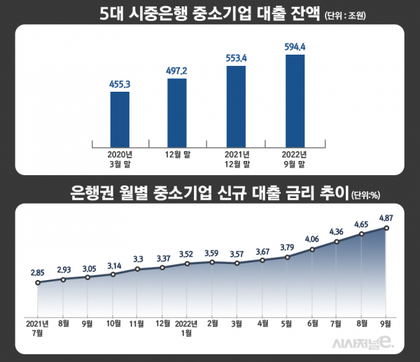 [시사저널e=유길연 기자] 코로나 기간 불어난 시중은행의 중소기업 대출자산이 부실의 뇌관으로 떠올랐다. 대출 금리가 크게 오르면서 중소기업의 부담이 크게 늘었기 때문이다. 중소기업은 최근 채권시장 불안정성으로 인해 은행 대출을 받지 않으면 자금조달이 사실상 불가능한 상황이다. 우량한 기업이 은행 대출에 대한 이자부담을 이겨내지 못하고 ‘흑자도산’할 경우 시중은행도 부실 사태를 피할 수 없을 것이란 우려가 나온다.