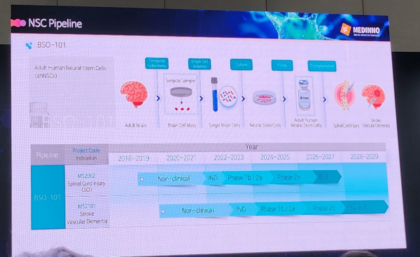 이어 성인 뇌 질환 대상 치료제로 확대한다는 게 메디노의 계획이다. 주 이사는 “신경세포를 만드는 능력이 뛰어난 신경줄기세포를 이용해 손상된 뇌 조직 재생 치료제를 개발할 예정”이라고 밝혔다. “사람의 뇌에서 분리배양한 신경줄기세포를 기반으로, 척수손상과 뇌졸중 질환 치료제를 개발할 것”이라고 했다.