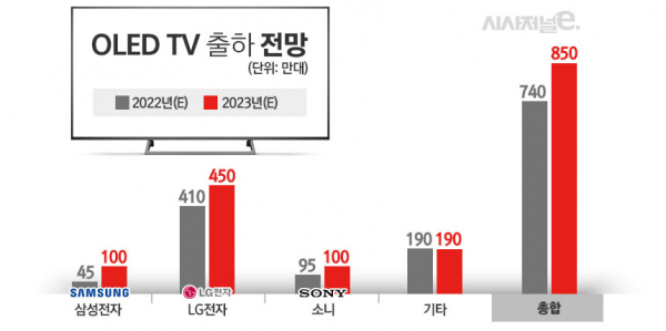 이충훈 유비리서치 대표는 “LG전자는 물량을 450만대로 보수적으로 늘리고, 삼성전자는 100만대까지 2배 늘릴 것으로 본다”며 “소니의 지난해 물량은 130만대 정도인데 올해는 95만대로 감소한다. 내년에는 올해와 비슷한 100만대 정도가 될 것”이라고 전망했다.