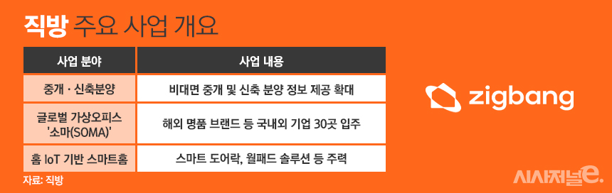 2012년 원룸 중개로 사업을 시작한 직방은 2018년 아파트 매매 및 중개로 사업을 넓혔다. 부동산 정보제공 앱 '호갱노노'를 인수해 매물에 대한 기본 정보는 물론 단지 내 시설이나 주변 인프라 등 정보 제공에 집중했다. 코로나19 대유행이 시작하면서 자회사 온택트파트너스를 설립해 비대면 중개 라이브 등 중개 사업 영역을 확대하기도 했다.