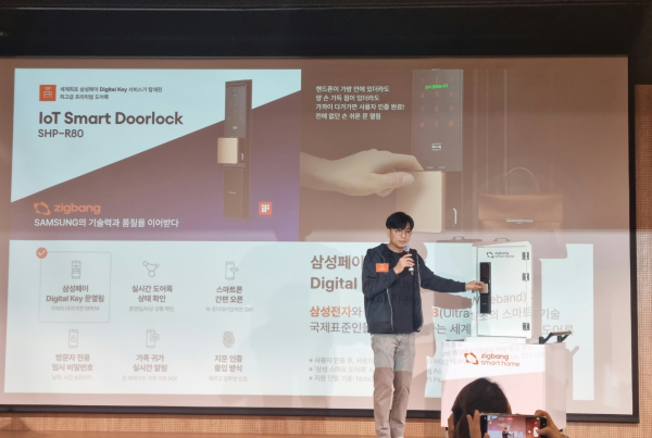 직방은 이날 삼성전자와 협업한 스마트 도어록 신제품을 출시하기도 했다. 스마트폰을 꺼내 직접 갖다 대야만 열 수 있었던 NFC 도어록과 달리, 삼성페이 디지털키를 발급 받은 스마트폰을 갖고 도어락에 다가가기만 해도 잠금 해제가 가능한 시스템이다. 기기 간 보안 통신을 구축해 보안성도 강화했다는 설명이다.