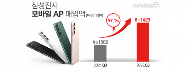 [시사저널e=이호길 기자] 삼성전자의 지난 3분기 모바일 애플리케이션 프로세서(AP) 매입액이 전년 동기 대비 2배 가까이 증가한 것으로 나타났다. AP 단가 상승과 고환율 여파가 반영됐기 때문이지만, 자체 개발한 엑시노스의 시장 점유율이 하락하고 퀄컴 의존도가 높아지면서 삼성전자 가격 협상력이 약화됐단 분석도 나온다. 삼성전자는 내년 초 출시하는 플래그십 스마트폰 ‘갤럭시S23’ 시리즈 전량에 퀄컴 AP를 탑재할 예정이어서 비용 부담은 더 높아질 것으로 보인다.