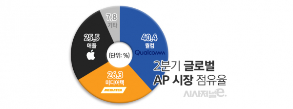 글로벌 AP 시장에서 퀄컴 입지는 강화되는 추세다. 시장조사업체 스트래티지 애널리틱스(SA)에 따르면 지난 2분기 퀄컴의 시장 점유율은 40.4%로 전년 동기(36%) 대비 4.4%포인트 상승한 반면 삼성전자는 미디어텍과 애플에 밀려 기타 업체로 분류됐다. SA는 삼성전자의 시장 점유율을 공개하지 않았지만, AP 출하량은 지난해 같은 기간보다 46% 감소했다고 밝혔다.