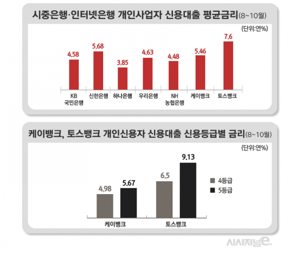 6일 금융권에 따르면 토스뱅크가 올해 8~10월 동안 개인사업자에게 새로 내준 신용대출의 전체 평균 금리는 7.6%다. 대형 시중은행 대비 최대 2.75% 높은 수준이다. 같은 기간 5대 시중은행의 평균 금리는 3.47~5.68%을 기록했다. 케이뱅크(5.46%)보다도 2.14%포인트 크게 높다.