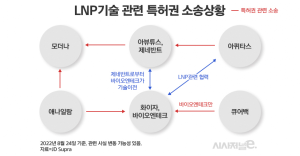모더나와 화이자는 현재 복수 기업과 LNP 관련 특허 소송에 직면해있다. 지난 2월 아뷰튜스와 제네반트가 모더나를 델라웨어 지방 법원에 고소한 데 이어, 3월엔 앨나일람이 모더나와 화이자를 각각 고소했다. 초기 mRNA 개척자로 불리는 독일 기업 큐어백은 바이오엔텍을 고소한 것으로 알려졌다.