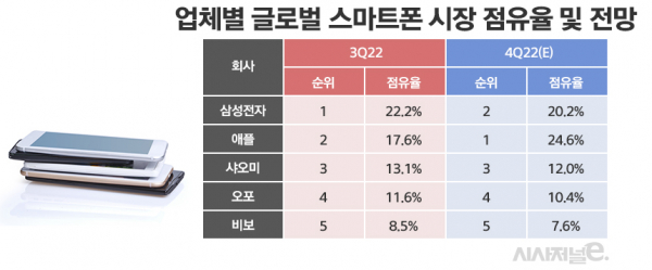 [시사저널e=이호길 기자] 삼성전자가 4분기에 스마트폰 시장 점유율 1위 자리를 애플에 넘겨줄 것으로 전망된다. 9월에 공개된 ‘아이폰14’ 출하량이 4분기에는 지난 8월 출시한 폴더블폰 ‘갤럭시Z폴드4’와 ‘갤럭시Z플립4’와 비교해 큰 폭으로 늘어날 것으로 보인다.