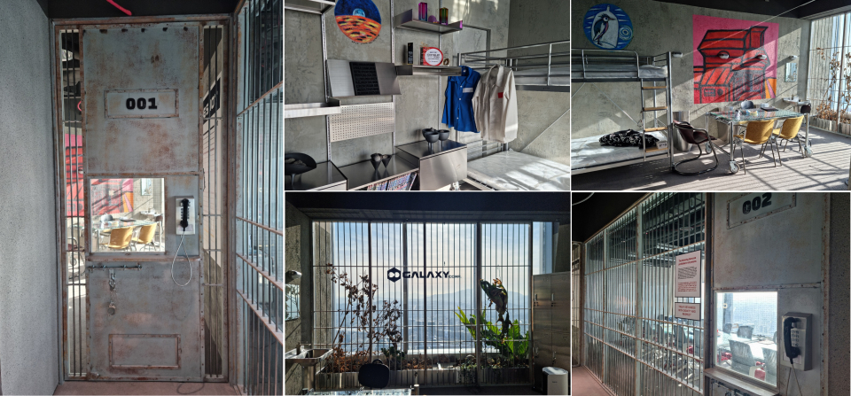 감옥 콘셉트로 꾸며진 회의실도 눈에 띄었다. 갤럭시코퍼레이션 직원들이 이 안에서 최대한 많은 아이디어를 얻기 위한 디자인 전략이 숨어 있다. 회의실 내부는 실제 감옥처럼 2층 침대와 세면대 등으로 꾸며져 있다.