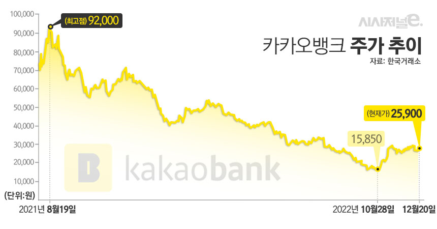 21일 업계에 따르면 지난 20일 카카오뱅크 주가는 2만5900원에 마감했다. 지난 14일에는 장중 3만원선을 넘기며 지난 10월 28일 최저가(1만5800원)를 기록한 후 6주 만에 두 배 가까이 상승했다. 모회사인 카카오 등 기술주와 성장주도 해당 기간 회복세를 보였지만 카카오 그룹주 중 카카오뱅크의 상승세가 가장 가팔랐다.