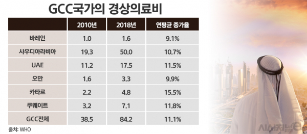 실제 GCC 6개국(UAE·사우디아라비아·카타르·쿠웨이트·오만·바레인)의 경상의료비는 지난 20년간 연평균 11.1%에 달하는 증가율을 보였다. 2000년 127억달러에서 2018년 842억달러로 늘었다. 경상의료비란 1년간 국민 전체가 보건의료재화와 서비스를 구매하는데 지출한 최종 소비를 의미한다. GCC의 모든 국가가 연평균 9% 이상의 증가율을 나타냈으며, 카타르(15.5%), 쿠웨이트(11.8%), UAE(11.5%) 순이었다.