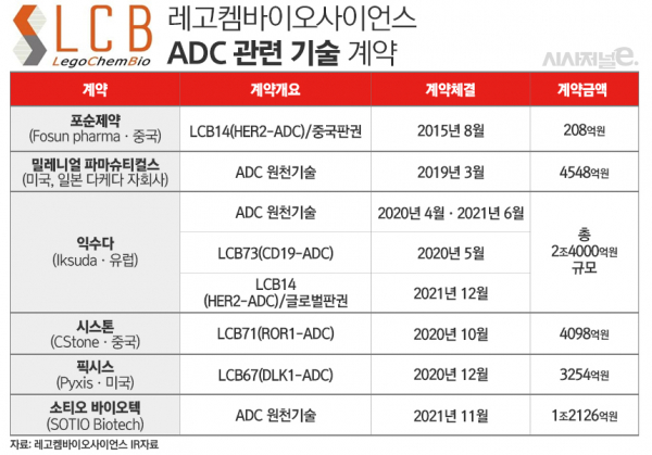 레고켐바이오사이언스는 다수 해외 제약사와 ADC 후보물질과 원천기술 이전 계약을 맺은 바 있다. 2019년 일본의 대형 제약사인 다케다의 미국 자회사 밀레니얼 파마슈티컬스와 4548억 원 규모의 기술 이전 계약을 했다. 영국 익수다(Iksuda) 중국의 시스톤(CStone), 포순 제약(Fosun pharma), 미국의 픽시스(Pyxis)와도 계약을 맺었다. 소티오 바이오텍(SOTIO Biotech)와의 계약 규모는 총 1조 원이 넘는 것으로 나타났다.