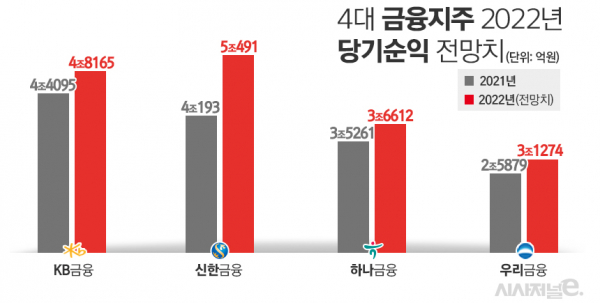 [시사저널e=유길연 기자] 금융지주가 올해 역대급 실적을 예고하면서 한 해 영업을 마쳤다. 신한금융지주는 올해 역대 최초로 순익 5조원을 넘기면서 ‘리딩금융’ 타이틀을 탈환할 가능성이 크다. 당기순익 3·4위 자리는 지난해와 같이 하나금융지주와 우리금융지주가 각각 차지할 것으로 전망된다. 다만 본업에 대한 성적인 영업이익은 3위 자리를 두고 마지막까지 치열한 경쟁이 벌어질 것이란 예상도 나온다.