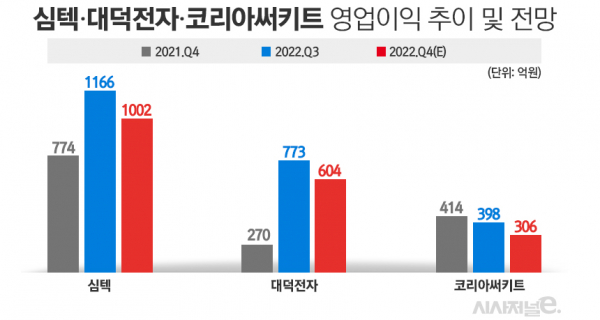 기판업체들의 실적은 지난해 4분기부터 역성장한 것으로 보인다. 금융정보업체 에프앤가이드에 따르면 심텍의 지난해 4분기 영업이익 전망치는 1002억원으로 전 분기(1166억원)보다 약 14% 감소한 것으로 추정된다. 앞서 심텍은 지난해 11월 3분기 실적을 발표하면서 4분기 매출과 영업이익이 전방시장 수요 둔화에 따라 전분기 대비 소폭 감소가 예상된다고 밝힌 바 있다.