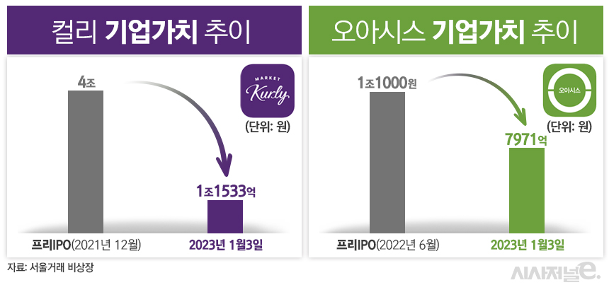 컬리와 달리 유일하게 설립 이래 흑자를 내고 있는 오아시스도 기업가치 하락은 피하지 못했다. 지난해 6월 이랜드리테일로부터 330억원의 투자를 유치하며 1조1000억원 규모의 기업가치를 인정받았지만, 현재 7900억원대로 떨어졌다.