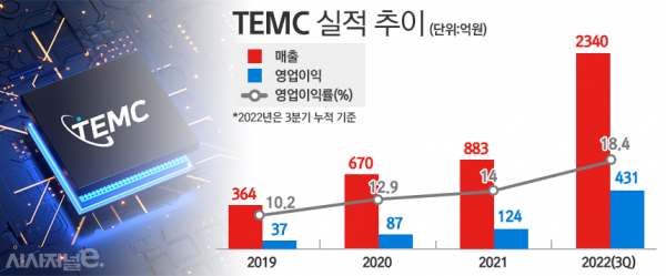 티이엠씨 매출 규모는 2019년 일본의 반도체 핵심 소재 수출 규제 이후 공급망 내재화 중요성이 강조되면서 가파르게 성장했다. 특수가스는 최근 미중 무역분쟁 심화와 러시아·우크라이나 전쟁으로 국산화 필요성이 높아졌다.