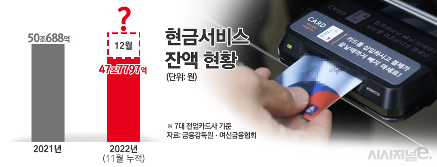 업계는 최근 카드사들이 리스크 관리에 나서면서 카드론 규모가 줄어든 것으로 분석했다. 문제는 카드론 취급이 어려워진 중·저신용자들이 현금서비스를 늘려가고 있단 점이다. 지난해 물가가 올라 지출액이 늘어난 가운데 금융권 대출 금리가 급등하면서 이자 부담이 커지고 제2금융권 회사들이 건전성 관리를 위해 대출 줄이기에 나서자 현금서비스가 폭증했단 분석이다.