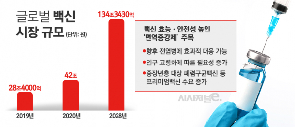 글로벌 백신 시장 규모는 확대할 전망이다. 새로운 전염병의 등장과 이에 따른 정부 접종 프로그램 확대, 노인인구 증가 등의 영향이다. 업계는 백신 시장 규모가 올해만 30% 성장할 것이라고 예상했다. 보건복지부가 지난해 11월 발표한 '2023 백신·치료제 지원 가이드북'에 따르면, 2028년 글로벌 백신 시장 규모는 1035억 달러(약134조 3430억 원)에 달할 것으로 전망된다. 백신 산업은 당분간 고성장을 지속할 것으로 보인다.