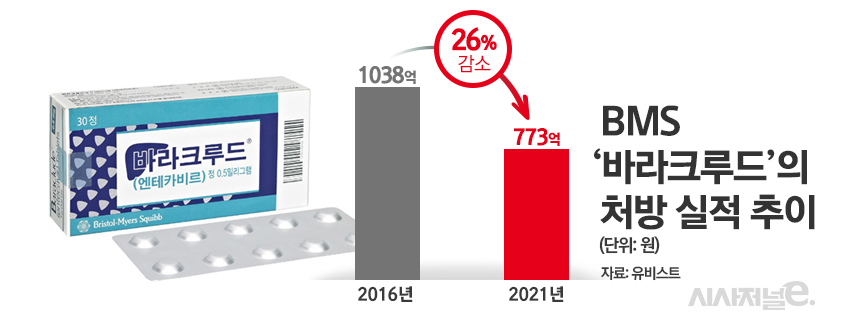 의약품 시장조사기관 유비스트에 따르면 바라크루드의 국내 원외처방 실적은 2016년 1038억원에서 2021년 773억원으로 5년새 25% 감소했다.