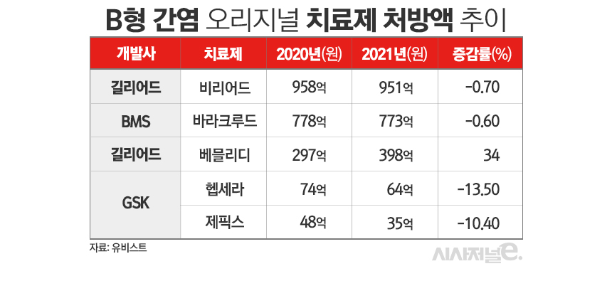 국내 시장 점유율을 확대하는 것이 다른 오리지널 치료제도 상황은 비슷하다. 국내 시장 점유율 1위 비리어드는 2020년 958억원에서 2021년 951억원으로 0.7% 감소했고, GSK의 '헵세라', '제픽스'도 10% 이상 떨어지며 국내 시장에서 퇴출 위기를 맞았다.