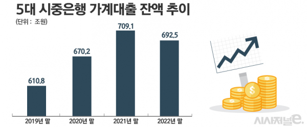 특히 5대 시중은행(KB국민·신한·하나·우리·NH농협)의 감소폭이 컸다. 작년 말 가계대출 잔액 총합은 692조5335억원으로 1년 전 대비 16조5194억원 급감한 것이다. 작년 1월부터 12월까지 12개월 연속으로 대출이 줄었다. 그 결과 시중은행의 전체 대출자산 성장률도 올해 크게 꺾였다.