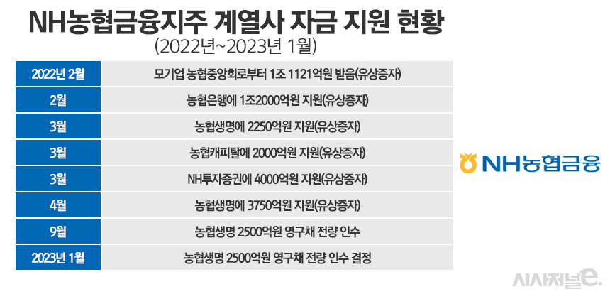 농협금융이 자본확충에 나서는 원인 중 하나는 농협생명 때문이다. 농협금융은 자본건전성에 문제를 일으킨 농협생명에 지난해와 올해 초까지 1조1000원의 자금을 내려보냈다. 작년 3월, 5월 각각 진행된 농협생명 유상증자에 참여해 총 6000억원의 자금을 투입했다. 9월에는 농협생명이 발행한 2500억원의 영구채를 모두 인수했고, 지난달 말 2500억원의 영구채를 추가로 매입하기로 했다.