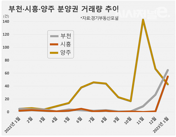9일 경기부동산포털 부동산거래현황을 살펴보면 지난달 경기도 시·군 내에서 분양권·입주권 거래가 가장 많았던 지역 1~3위는 부천시(65건)·시흥시(55건)·양주시(43건) 순이었다. 세 곳의 거래량은 경기도 전체(401건)의 41%를 차지한다. 부천시의 경우 전년 동기(5건) 대비 10배 이상 늘어난 수준이다. 작년 월평균 3~5건에 머물다가 12월(25건)을 기점으로 거래량이 늘었다. 시흥시도 지난해만 해도 거래량이 평균 2건에 머물렀지만 올해 들어 급격히 증가했다.